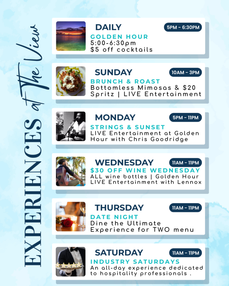 Discover bold Caribbean flavors and Bajan-inspired dishes on our menu. Don’t miss favorites like the Roasted Duck Leg, Bajan Bites, West Indian Curry Dish and The View Summer Salad!